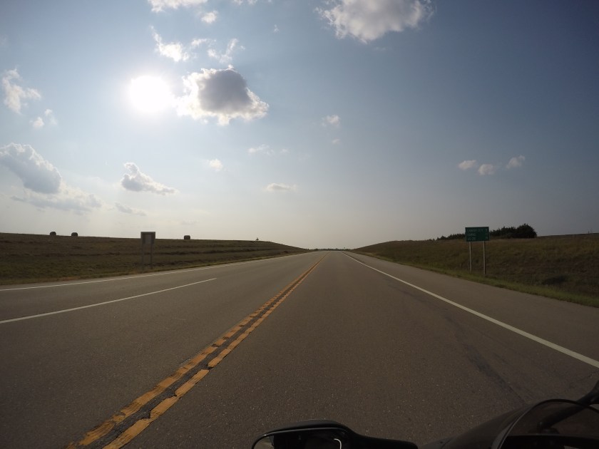 From the city limits, we headed west out on I-435 west. We did about 100 miles since leaving Clinton before stopping for a snack break and gas. A lot of places only have a high of 91 octane out west it seems. Our motorcycles suggest 93 octane, so we have to settle for 91. Acter filling up, Gabe was hungry so we tried to go to a place called The Roost in Lawrence, KS. It was a nice looking town and all of the cafe’s were packed. The Roost had a 45 minute wait. So, we found an espresso shop, had espressos and bagels then continued onward. It was actually a really nice town. Gabe and I were even talking about going back there in the future.