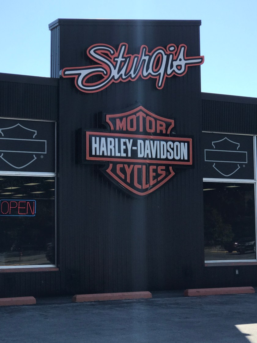 We motored along and arrived in Sturgis. For those of you that don’t know, Sturgis is an enormous rally/biker event that takes place every August. We stopped at the Sturgis Harley Davidson store for recommendations where to get a new tire for Christian. He has a wicked flat spot on his rear tire for the several days we rode all the straight flat spots from Ohio through South Dakota. It was getting bad. So, some folks at Harley suggested a place to go. We went to the suggested motorsports place and they hooked him up.