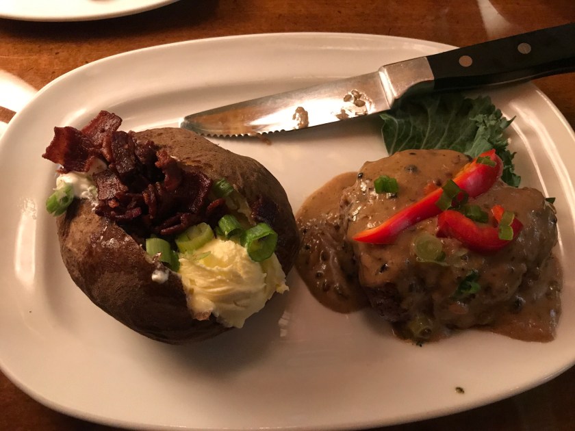 They both woke up hungry so we went across the parking lot for some food. I had a delicious steak dinner because I made a deal with Christian that since I got him a free room, he would get me a good dinner and we’d call it even. He agreed and the menu at The Montana Club did not disappoint. I ordered a nice steak dinner and Christian ordered a filet topped with crab and parmesan. It was delicious!