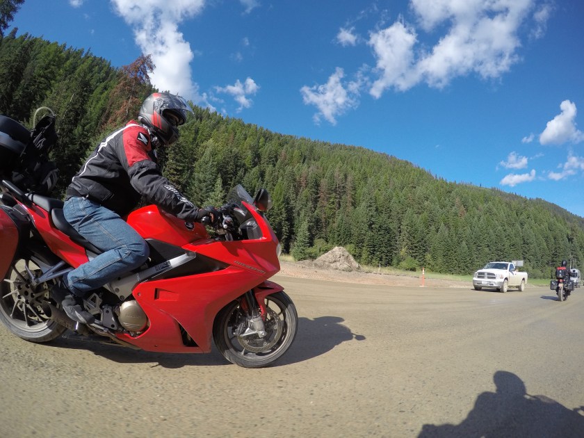 We stopped quick so I could clean my visor and while we were stopped I put on my winter riding gloves and rain pants to warm up. The rain pants help a lot to block the wind. We continued on and it finally cleared up and we were out of the fog. Then, we came around a bend and hit some road work. There was a 10 minute wait because they tore up the road and had to water it down before allowing traffic through. While waiting it was funny, we were watching some folks stretch the whole time, but maybe you had to be there.