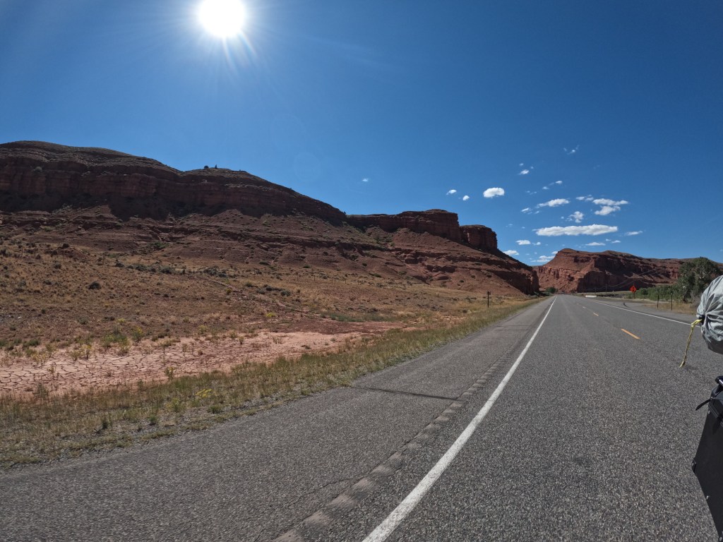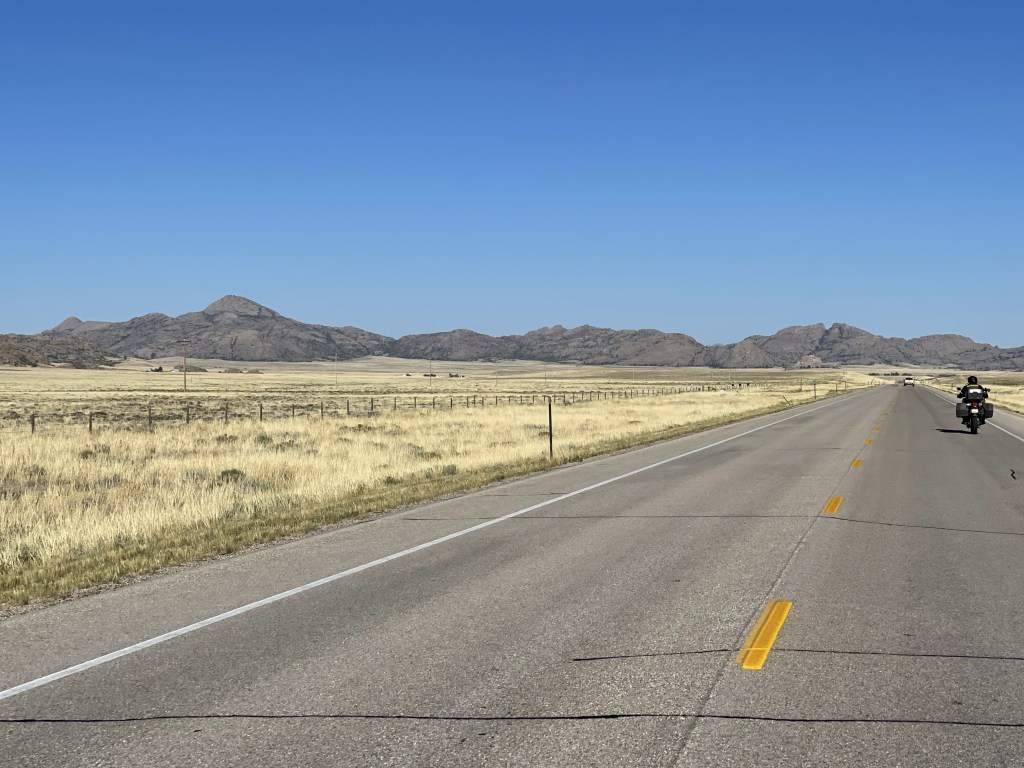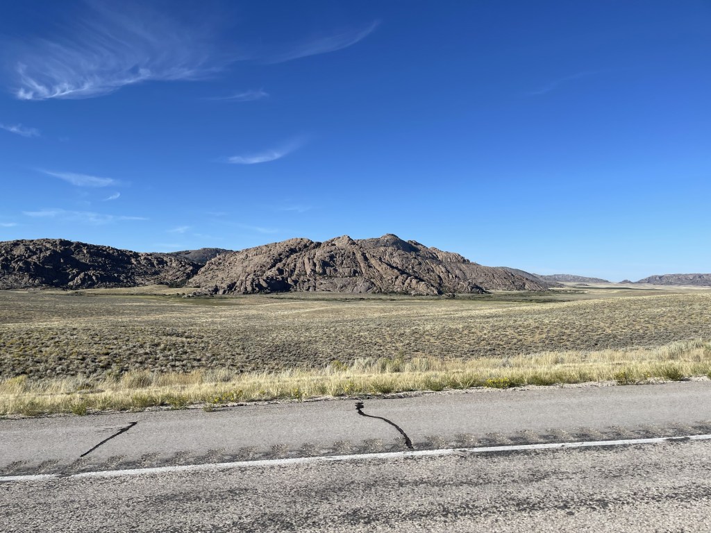After waiting we cruised on. There was some great scenery along the way, but very little civilization. It really makes you think how vast this country is. We passed Split Rock too. As we rode by I got some photos with the GoPro. I thought it was a famous historical spot and after looking online, I was right. Split Rock was a prominent landmark on the Oregon Trail due to its notch. Emigrants could see if for two days or more as they approached on the trail.