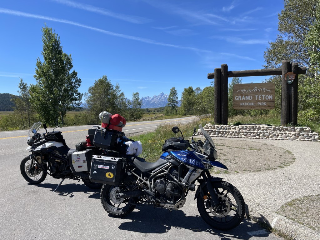 From the resort, we headed to Jackson, WY (Jackson Hole) but just rode through town. It was very busy and touristy so we continued into Grand Teton National Park. We stopped at the visitor center to see if they had any stickers for our panniers. Then, we took the scenic route through the park and along Jenny Lake. We were hoping to see a bull moose, but we never saw one. We also just rode through the park without stopping to hike. I’m sure if we were to hike, we could have, but who knows? The view of the Tetons is amazing anyway, but that would have been the icing on the cake!