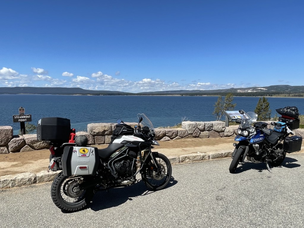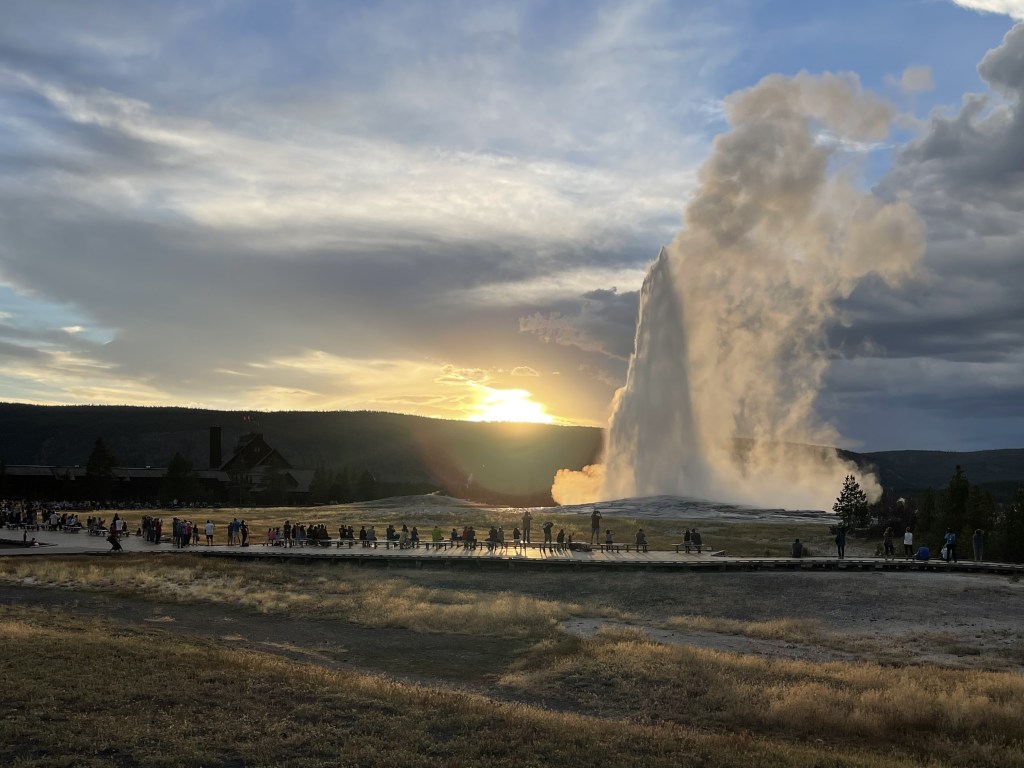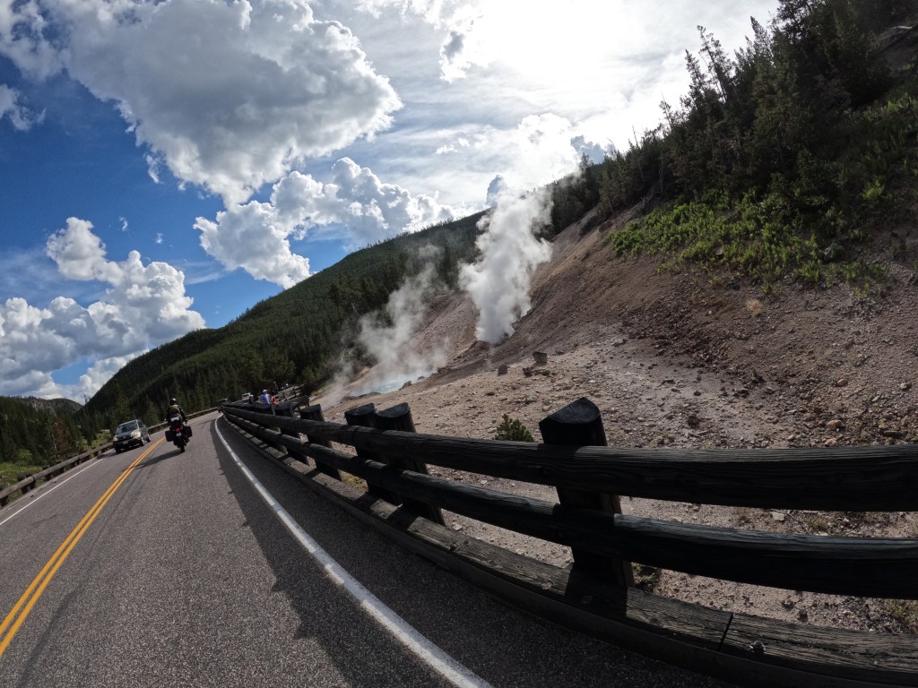 We got to Old Faithful Geyser just after seeing the bison. We must have just missed the eruption, but hey, that’s why they call it Old Faithful! It’s predicted to erupt about every 90 minutes. There are about 500 geysers in total in the park, but most of them are unpredictable. We waited until the next eruption and just hanging out. In the distance we were watching a wicked thunderstorm. By the time Old Faithful erupted, the bulk of the storm passed in the distance. We JUST missed it.  The temperature also dropped to about 45 degrees. It’s not fun riding in cold, wet conditions.