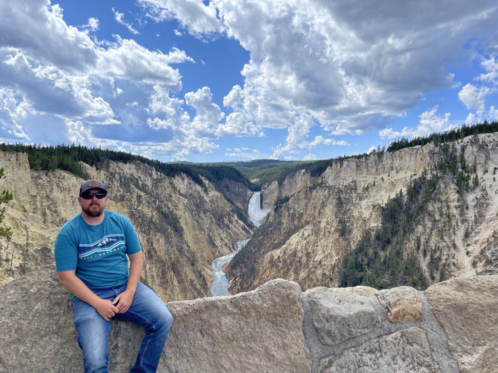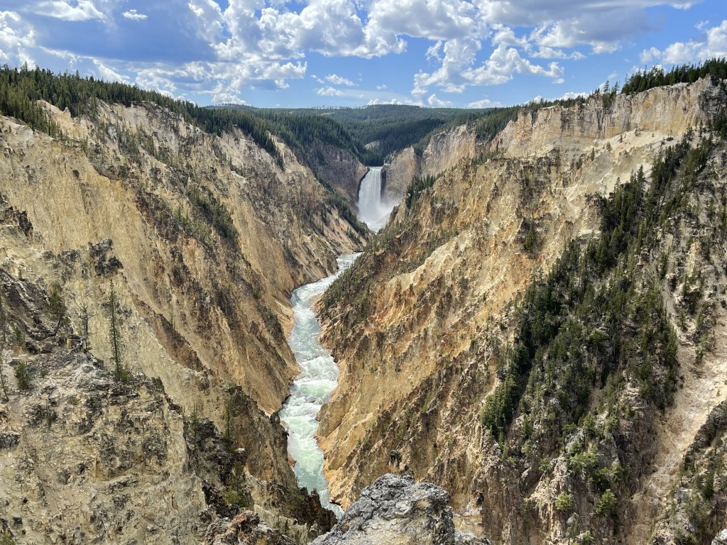 From there, we headed to Lower Falls. There is a nice little hike down to a concrete pad right where the waterfall begins. This is a sight to see! Its is a 308 foot waterfall that pours The mist that comes up from the fall leaves the canyon covered in green on the light colored rock formations of the canyon where the water breaks. The colors of the canyon are a result of hydrothermal alteration of rhyolite and rusting of iron in the rock as well.