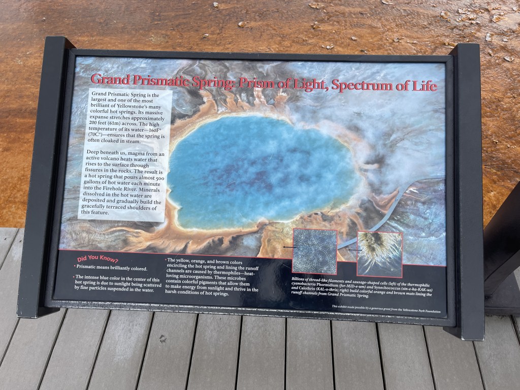 From there we headed to Grand Prismatic Spring. From an aerial view, this is an amazing hot spring to see. This spring is the largest in the United States and the third largest in the world. It is about 120 feet deep, about 370 feet long, and about 160 feet wide. There are bands of colors which look like a rainbow. This phenomenon happens due to temperature gradients in the water and the bacteria that live in each temperature gradient in the water. The bulk temperature of this spring is about 160 degrees Fahrenheit!