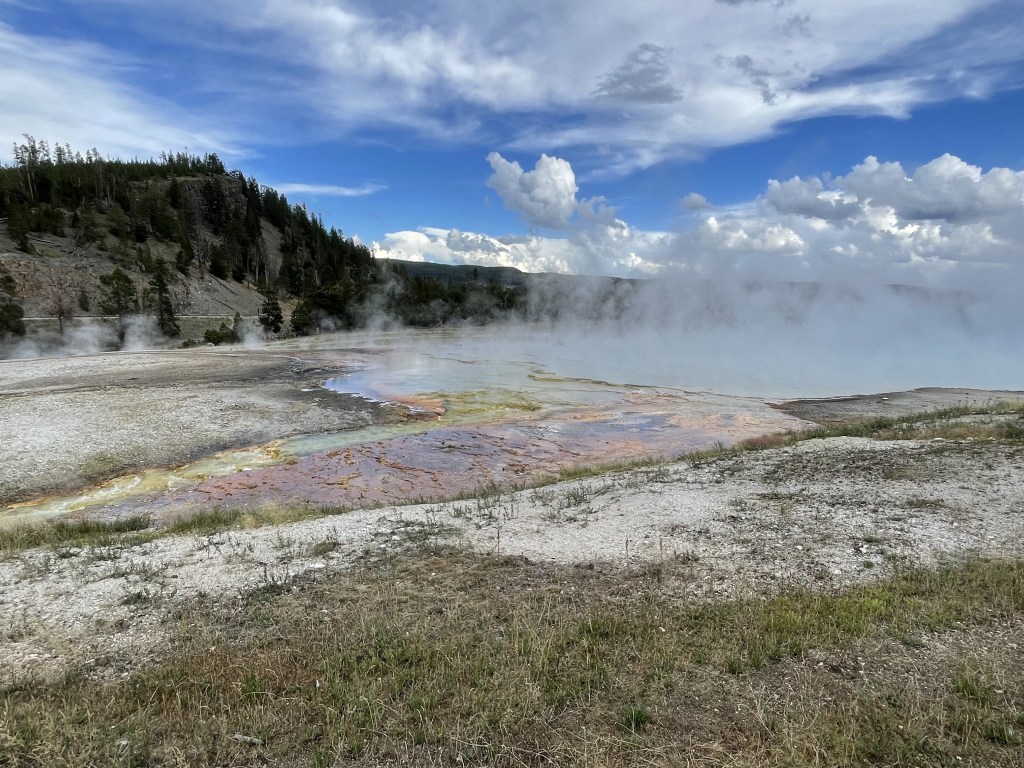 Further down the road, we passed Fountain Paint Pots and stopped to check it out. This was unique. It is essentially a hot spring with little water. So, hydrogen sulfide gas is emitted from the volcanic activity below the crust and rises through the muddy clay. When this happens, it forms muddy bubbles which bulge and burst. It’s really neat to see!