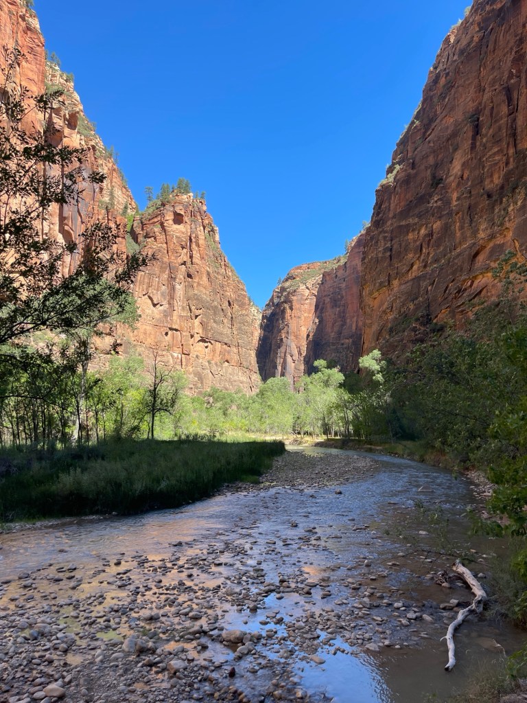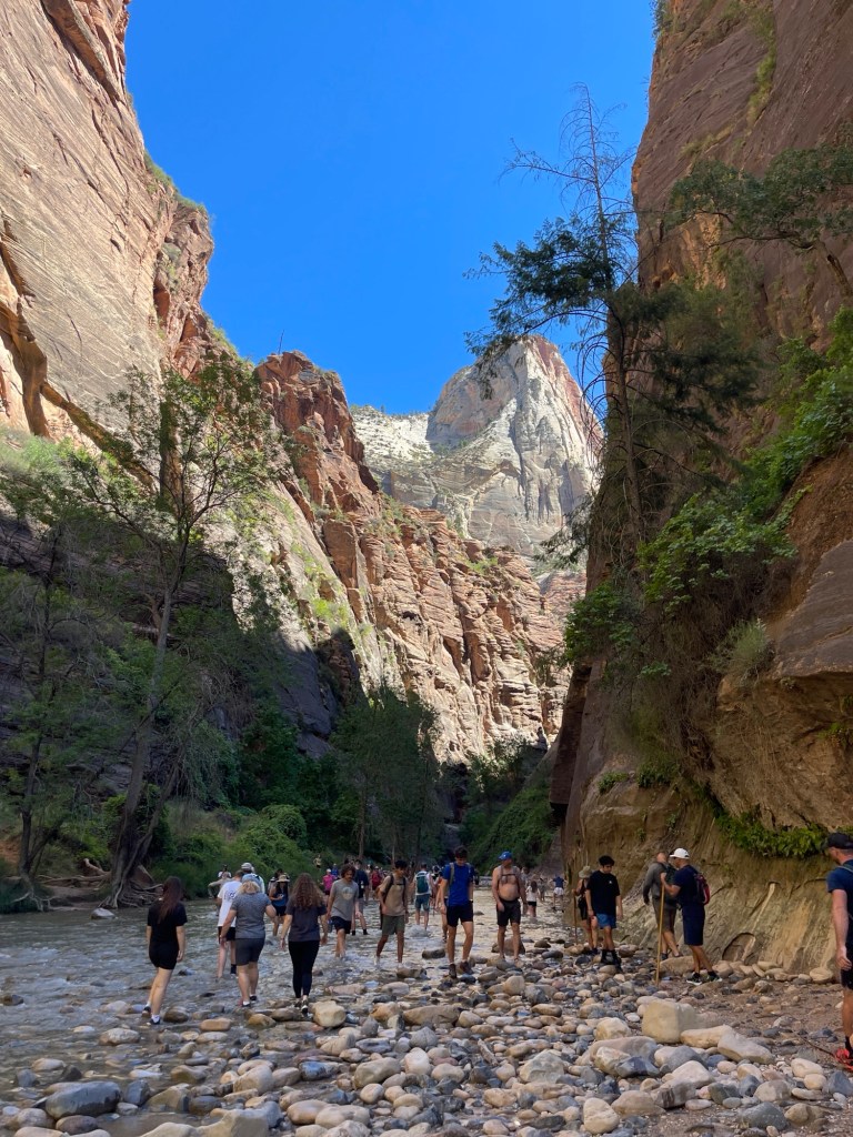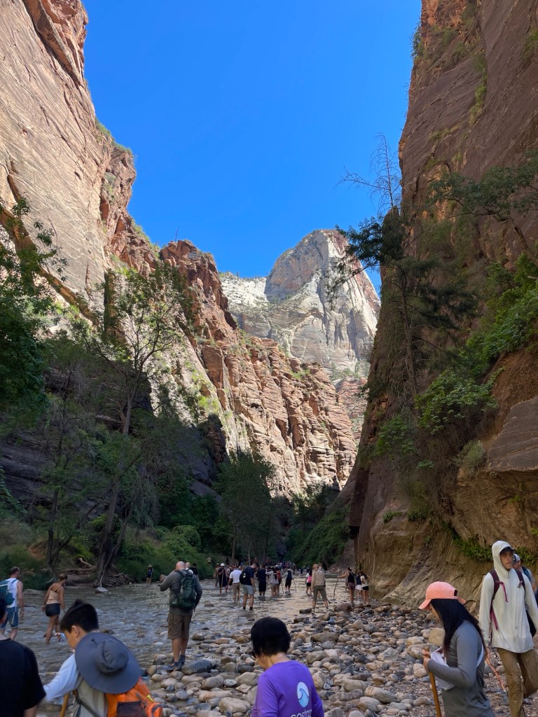 At the visitor center they have shuttle busses that take you up the park’s canyon. The views from the bottom of the canyon are spectacular! We took the shuttle to the last stop, Temple of Sinawava. This is the stop where you can go through “The Narrows” which is probably the #1 feature in the park.