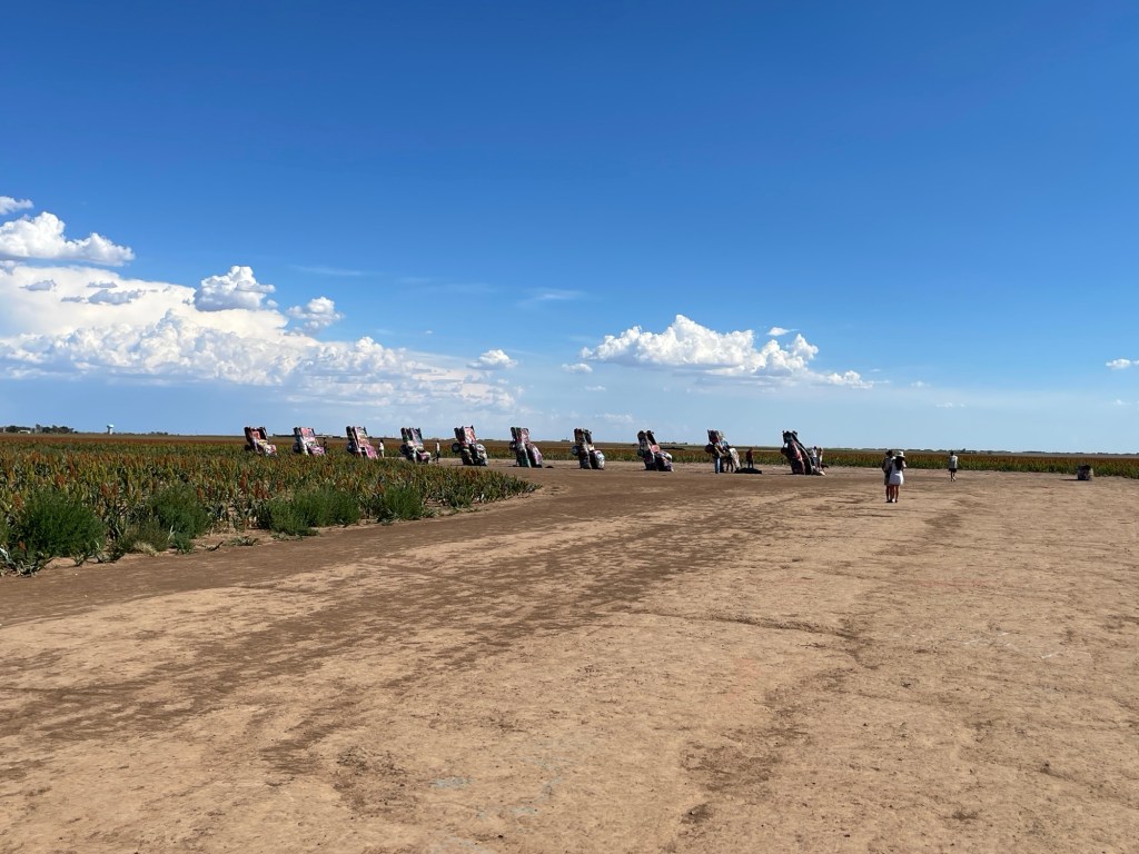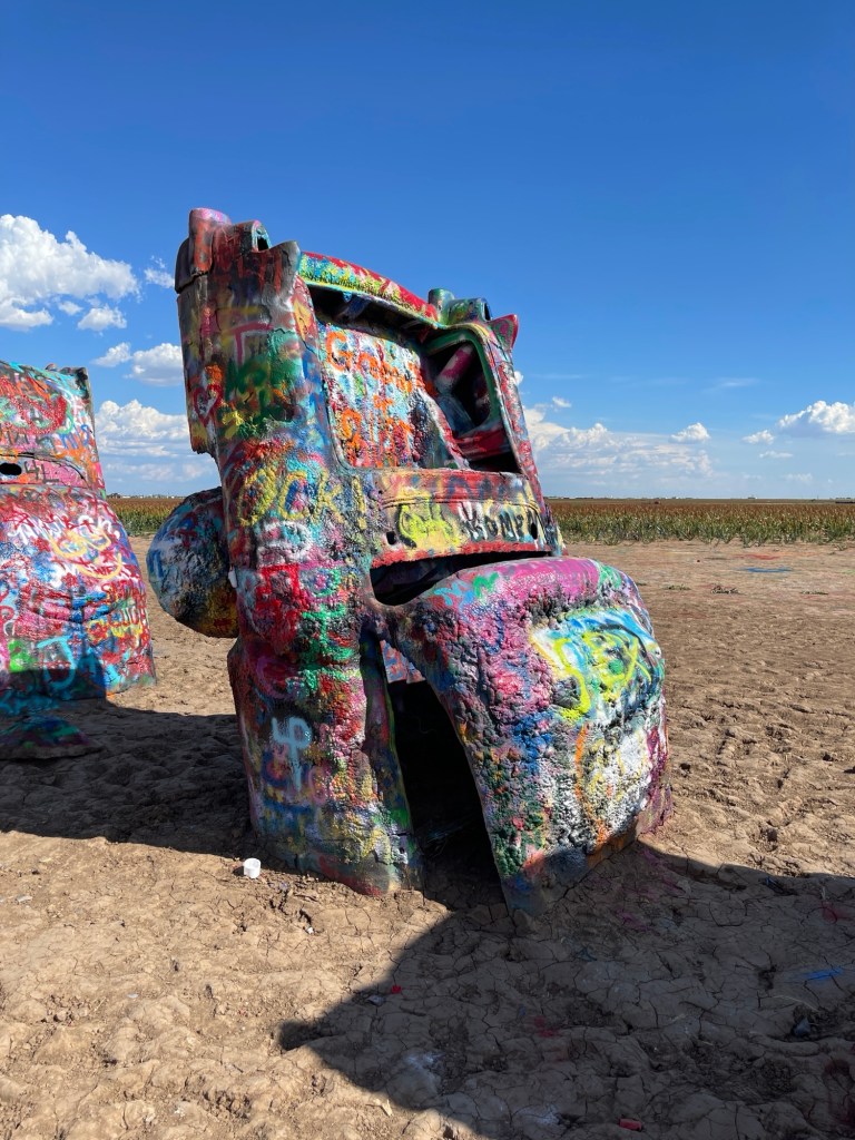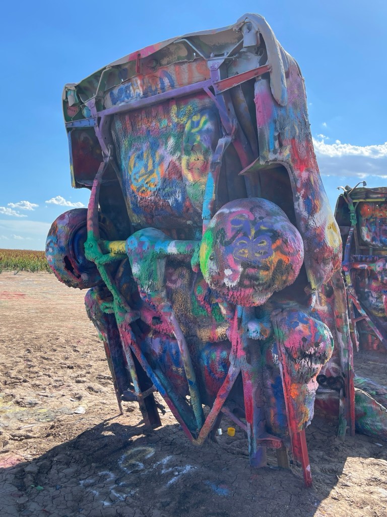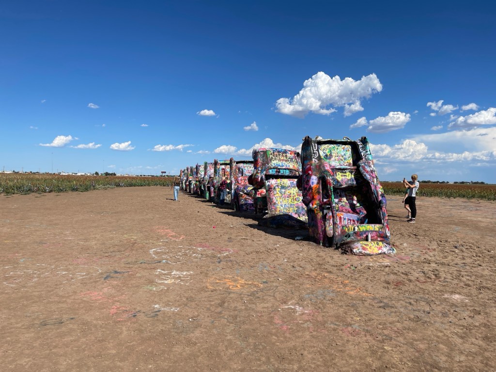 We continued down the interstate, crossed back into the Central Time Zone as we crossed into Texas, saw hundreds of wind turbines, and kept riding until we got to Cadillac Ranch in Amarillo. I saw it at some point and thought that would be cool to see. It’s something different. There’s a rancher that had semi-buried some Cadillac cars and it’s open for the public to check out. Apparently, people go there with spray paint cans to make their mark on them. I thought there was a lot more to see there, but it was unique and worth stopping since we were that close.