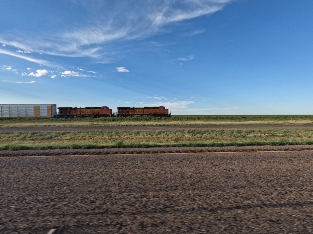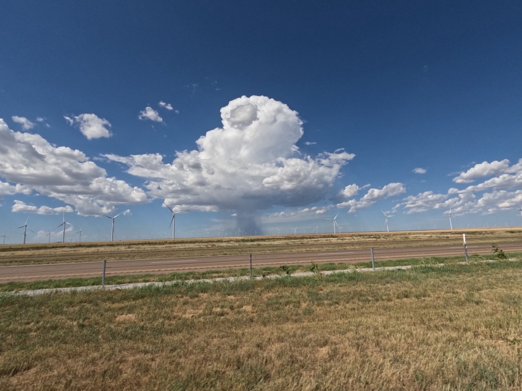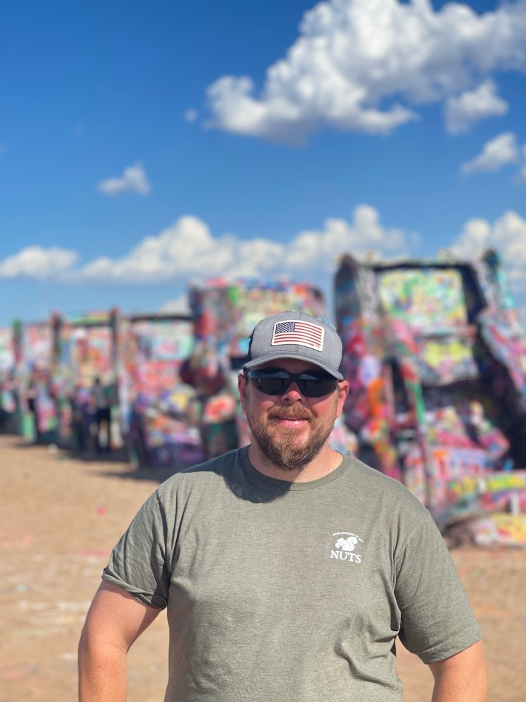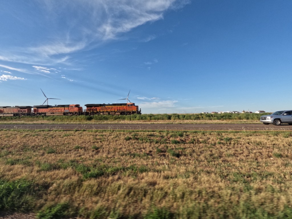 We continued down the interstate, crossed back into the Central Time Zone as we crossed into Texas, saw hundreds of wind turbines, and kept riding until we got to Cadillac Ranch in Amarillo. I saw it at some point and thought that would be cool to see. It’s something different. There’s a rancher that had semi-buried some Cadillac cars and it’s open for the public to check out. Apparently, people go there with spray paint cans to make their mark on them. I thought there was a lot more to see there, but it was unique and worth stopping since we were that close.