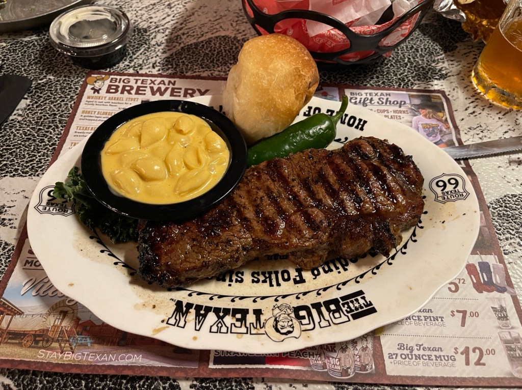 Once we finished taking photos, we headed to the steakhouse. It was another 20 minutes up the road. We got there and it was busy. There are about 28,000 Google reviews for The Big Texan. The place was big and they served people quick. About 30 miles before we got to the steakhouse we noticed a bunch of cattle at Quality Beef Products. We joked about having eaten any of them or if they’re sold to the steakhouse. There were hundreds or thousands of them. Anyway, they sat us immediately and we ordered some steaks. I got the 16oz Texas Sirloin and it was delicious! While there, we decided where to go and end the day.