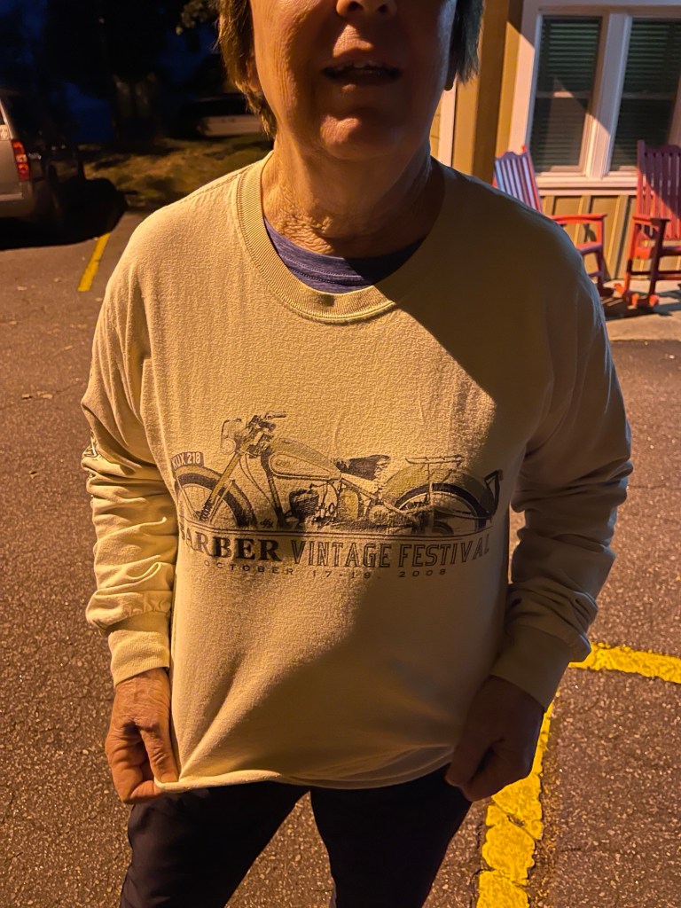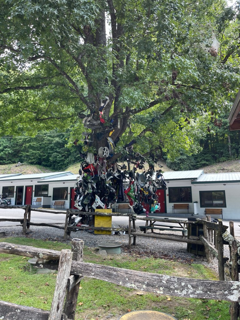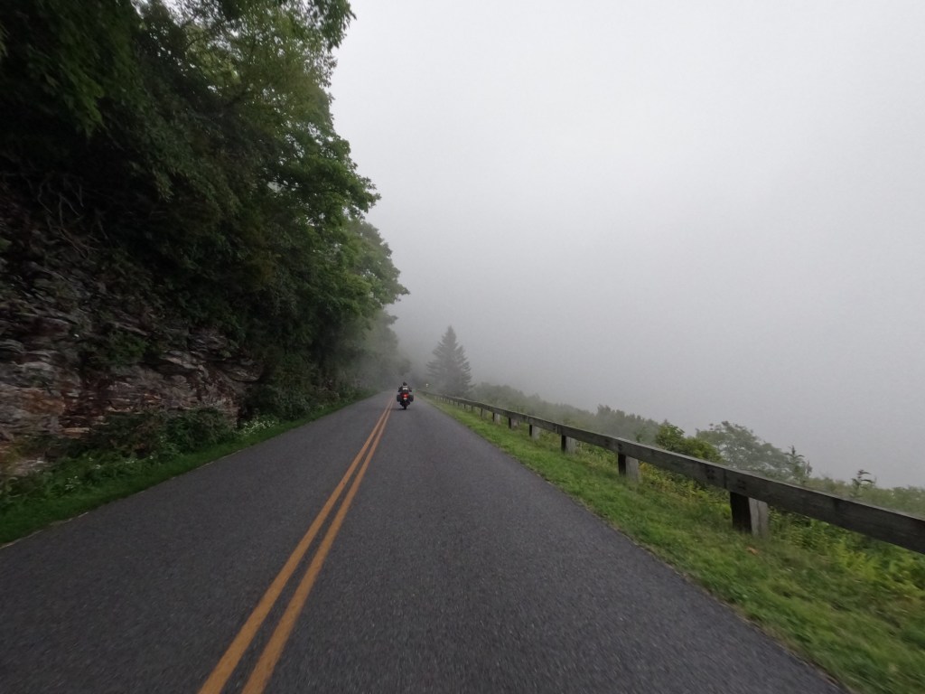 After hanging out for a little while, we left there and got back on the parkway. We kept riding until it got very foggy. At that time, we began looking for places to stay for the night. We didn’t want to ride through the dense fog at night in the dark. The temperature also dropped quite a bit and it was getting chilly. We just so happened to get off the parkway in Little Switzerland, NC to check it out quick near mile-marker 334. When we pulled off the parkway, there was a large sign for “Big Lynn Lodge” which was just a mile or so up route 226A. We pulled in and they had availability, so we decided to stay there. After checking in and getting to our designated parking space for our room, we met Ellen.
