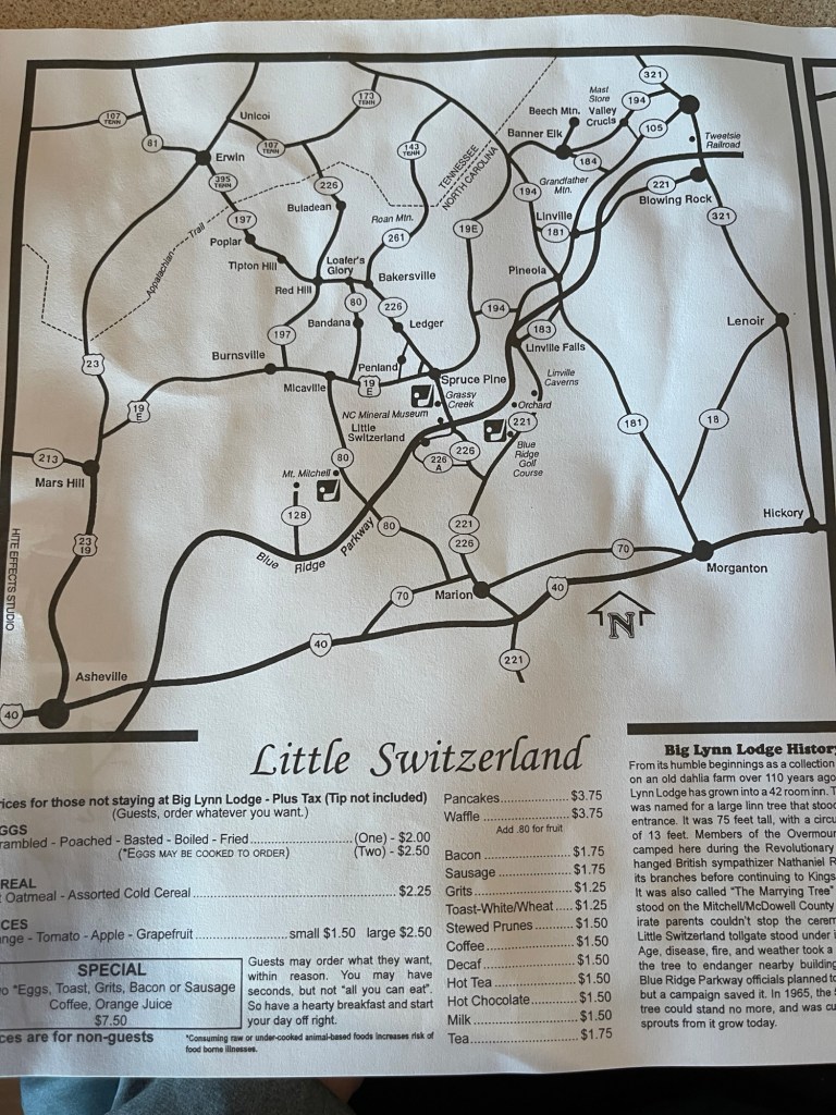 We got up and got ready for the day. Before leaving, we had breakfast at the lodge and realized there was a nice view. When we arrived the night before, it was too dark to notice the view. Their breakfast was amazing compared to the standard hotel breakfast we have been eating, so this was a nice treat. Ellen came back over to talk to us some more. She was showing us photos of her first motorcycles and telling us she’s been going to Big Lynn’s Lodge for years to meet up with friends. Unfortunately, we were on a tight schedule, so we didn’t check out any of her suggested routes in the area.